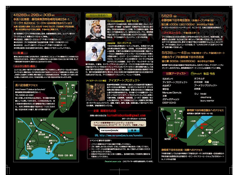 現在、古代ヤポネシア精神を復興する為に全国各地でのソロ演奏活動や日本列島における単筒笛文化啓発活動をしながら、故・秋辺今吉氏の意思を継ぐ為にワークショップも主催。