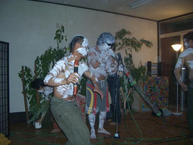 その後俺の出番。グンボルグの曲から始まり、2~3曲披露した後、聖君、イマッチ、あくさんをダンサーとして呼び、白塗りにして曲に合わせてどんなでもいいから踊ろうと言うと、最初は困惑していた3人だがイマッチがノリノリで踊り始め、聖君もあくさんも続いて踊りだす。そのうち全員参加しだし、ポンペさんもノリノリで踊りだした。