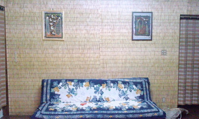 バティックのカバーをかけたソファーと兄貴から貰ったティンガティンガ。